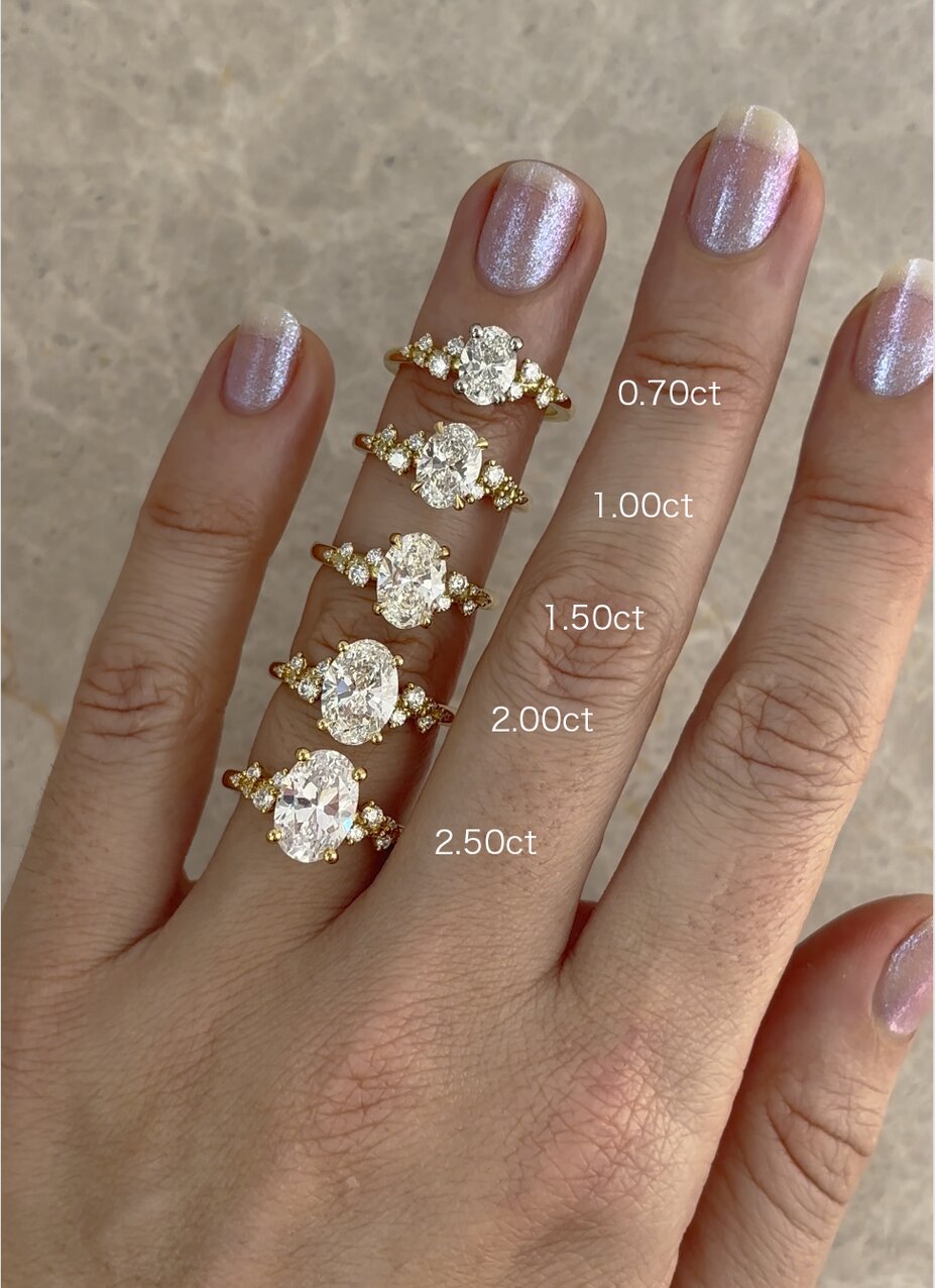 How large a diamond will appear on your finger depends on cut and shape just as much as it depends on carat size. Sometimes more. A well-cut smaller stone can feel more present than a larger diamond that's been cut with less intention. Although carat weight tells you heaviness, it doesn't tell you how the stone will look.