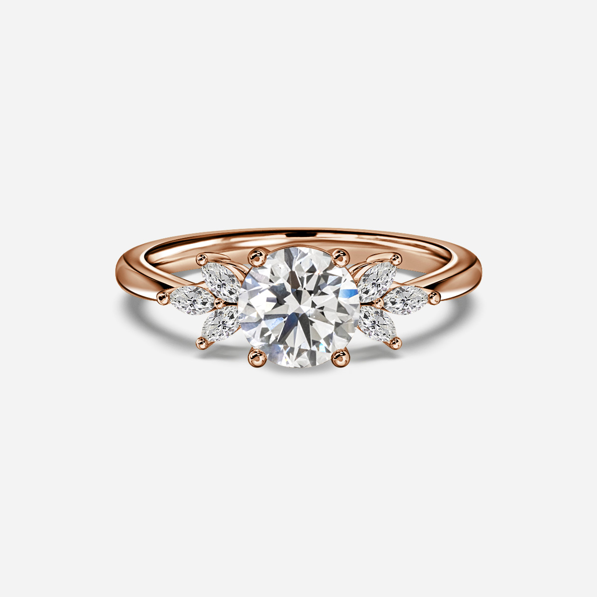 This rose gold trilogy engagement ring features a central gemstone surrounded by a cluster of three marquise-shaped diamonds on each side for a stunning and unique look. Handcrafted in Hatton Garden, London Centre Diamond Not Included Setting Only