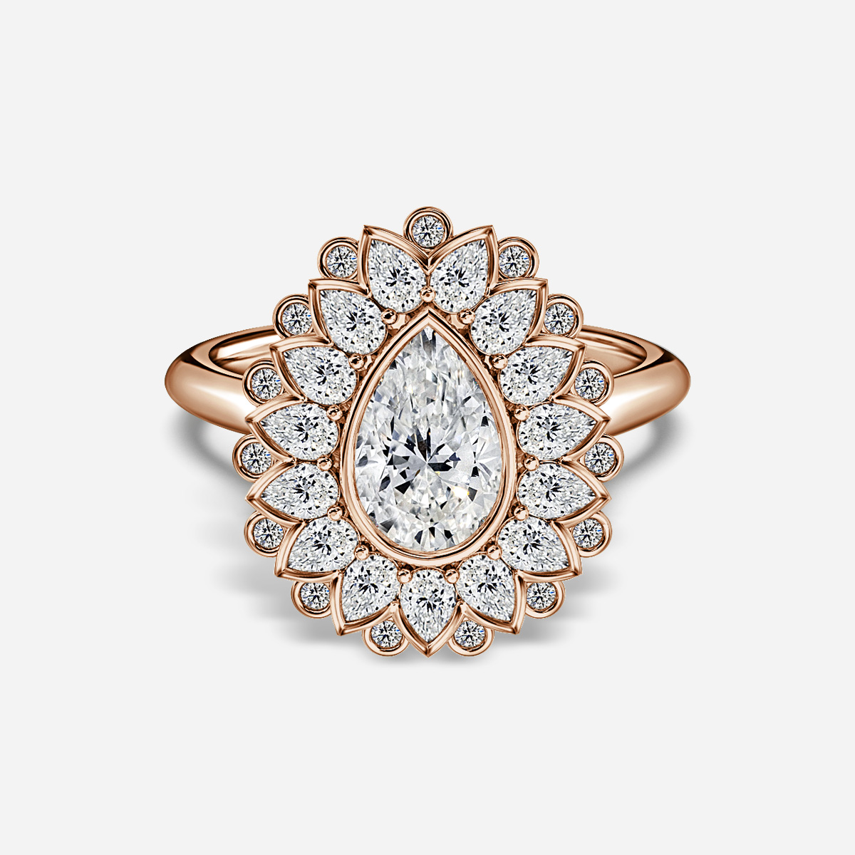 The Aelios Rose Gold Halo Engagement Ring showcases a brilliant center diamond surrounded by a halo of pear-shaped diamonds, with additional small round diamonds placed beyond the pear shapes. This luxurious rose gold setting creates a layered, radiant design, enhancing the ring’s elegance and extending its sparkling beauty. Handcrafted in Hatton Gardens, London. Centre Diamond Not Included Setting only