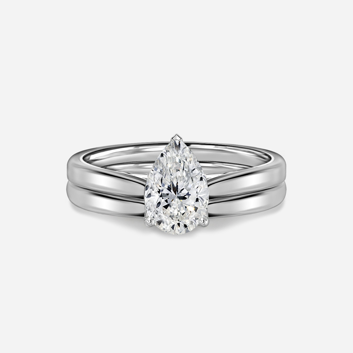 The Aerin Solitaire White Gold Plain Band Bridal Set features a stunning petal solitaire engagement ring paired elegantly with a palin band wedding ring, radiating timeless beauty and sophistication for your special day. This set epitomizes classic elegance and refined craftsmanship, symbolizing eternal love and commitment. Handcrafted in Hatton Gardens, London. Centre Diamond Not Included Setting only.