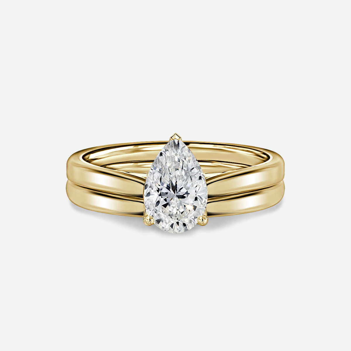 The Aerin Solitaire Yellow Gold Plain Band Bridal Set features a stunning petal solitaire engagement ring paired elegantly with a plain band wedding ring, radiating timeless beauty and sophistication for your special day. This set epitomizes classic elegance and refined craftsmanship, symbolizing eternal love and commitment. Handcrafted in Hatton Gardens, London. Centre Diamond Not Included Setting only.