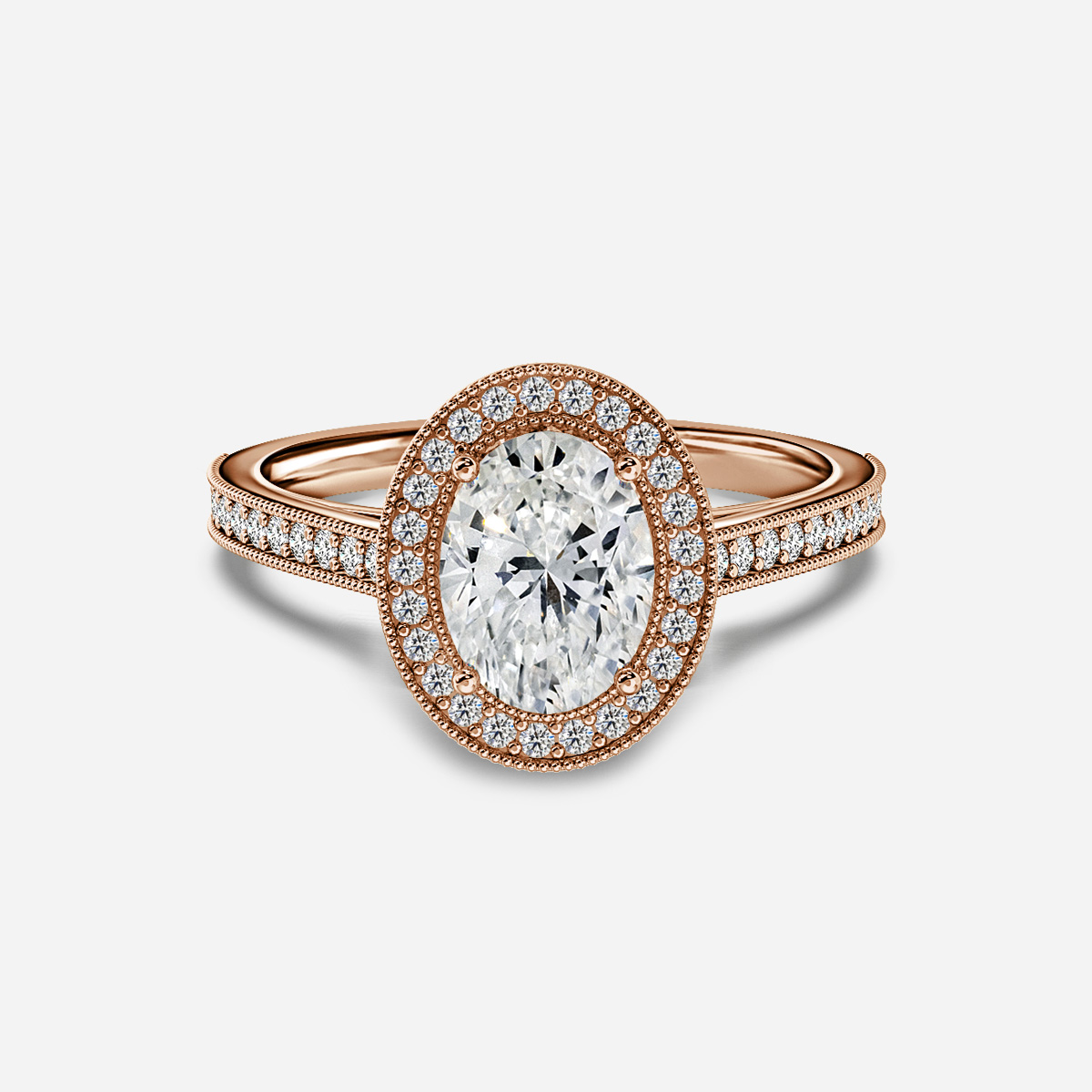 A rose gold milgrain set halo engagement ring is fully encrusted with pave set diamonds, providing an elegant and luxurious look. Handcrafted in Hatton Gardens, London. Centre Diamond Not Included Setting Only