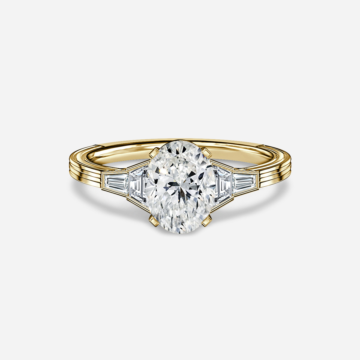 The Alissa Yellow Gold Trilogy Engagement Ring features a central diamond flanked by baguette diamonds on both sides in a classic trilogy setting, set in yellow gold for a timeless appeal. Handcrafted in Hatton Gardens, London. Centre Diamond Not Included Setting only