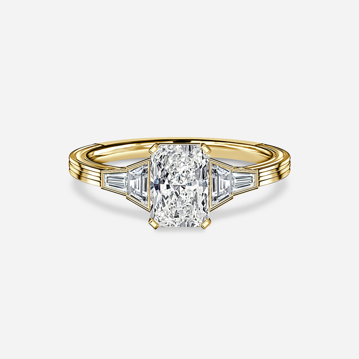The Alissa Yellow Gold Trilogy Engagement Ring features a central diamond flanked by baguette diamonds on both sides in a classic trilogy setting, set in yellow gold for a timeless appeal. Handcrafted in Hatton Gardens, London. Centre Diamond Not Included Setting only