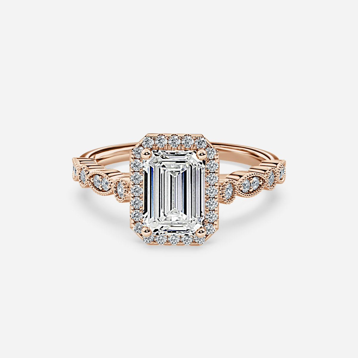 The Halo diamond engagement ring highlights a sparkling center stone made of rose gold , encircled by an ornate milgrain halo in a vintage inspired style. Handcrafted in Hatton Garden, London. Centre Diamond Not Included Setting Only