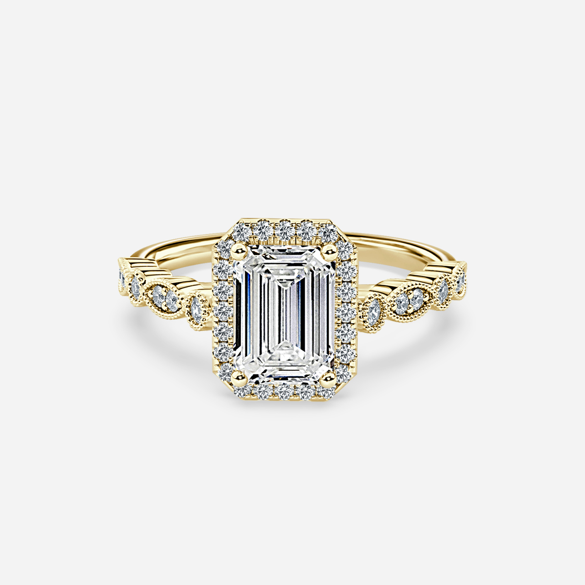 The Halo diamond engagement ring highlights a sparkling center stone made of yellow gold , encircled by an ornate milgrain halo in a vintage inspired style. Handcrafted in Hatton Garden, London. Centre Diamond Not Included Setting Only