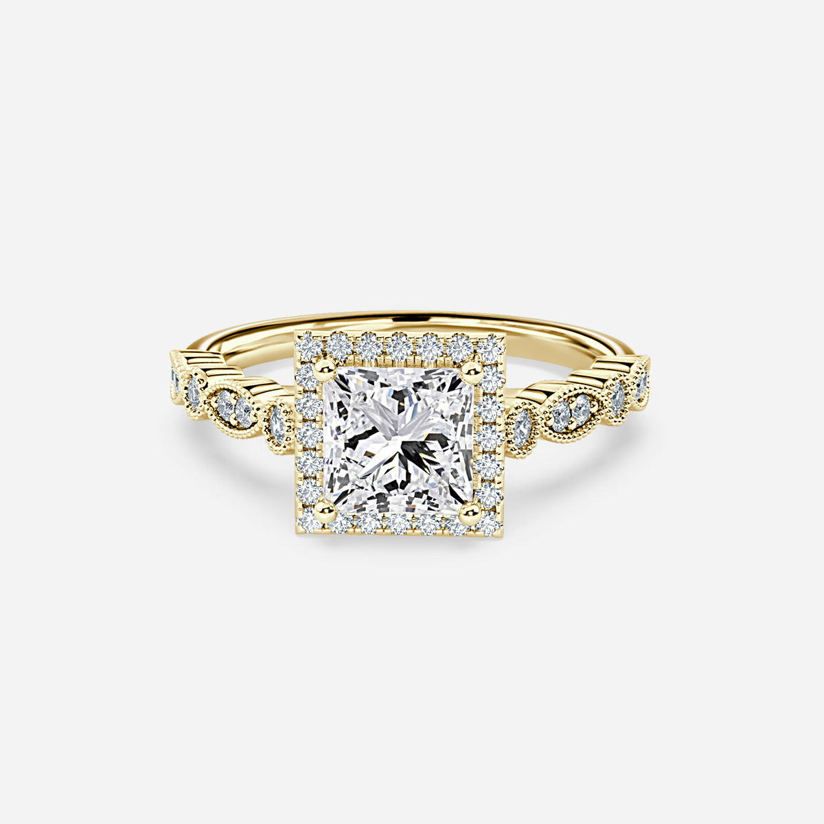 The Halo diamond engagement ring highlights a sparkling center stone made of yellow gold , encircled by an ornate milgrain halo in a vintage inspired style. Handcrafted in Hatton Garden, London. Centre Diamond Not Included Setting Only