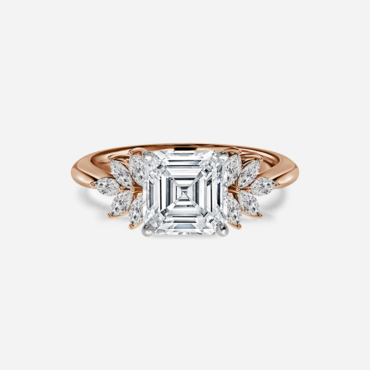 The Anastasia rose gold two tone features eleven stones in trilogy style ring, is the perfect symbol of your journey together. One either side of the beautiful centre stone are 5 delicately placed marquise cut diamonds that form to shape a leaf. Handcrafted in Hatton Gardens, London. Centre Diamond Not Included Setting only