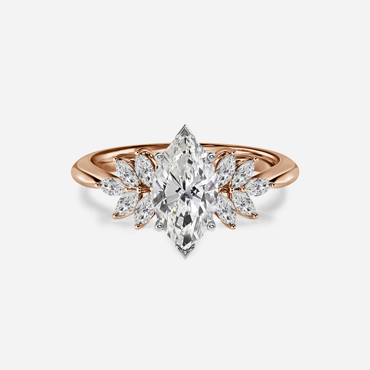 The Anastasia rose gold two tone features eleven stones in trilogy style ring, is the perfect symbol of your journey together. One either side of the beautiful centre stone are 5 delicately placed marquise cut diamonds that form to shape a leaf. Handcrafted in Hatton Gardens, London. Centre Diamond Not Included Setting only
