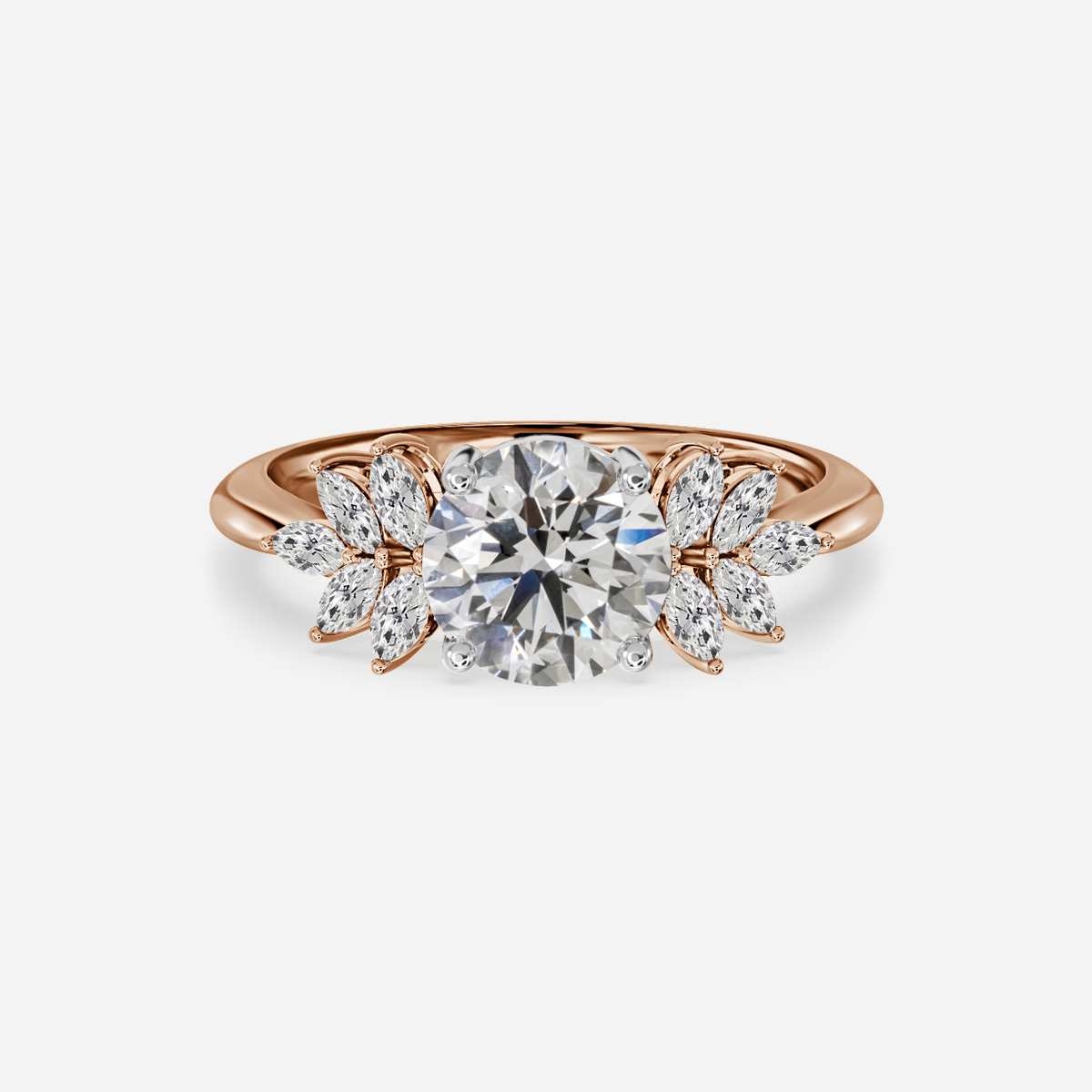 The Anastasia rose gold two tone features eleven stones in trilogy style ring, is the perfect symbol of your journey together. One either side of the beautiful centre stone are 5 delicately placed marquise cut diamonds that form to shape a leaf. Handcrafted in Hatton Gardens, London. Centre Diamond Not Included Setting only