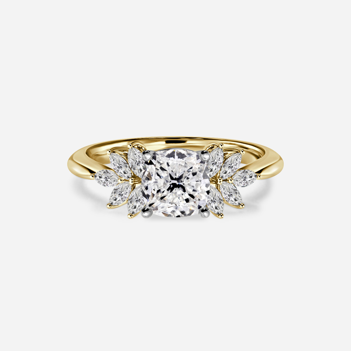 The Anastasia yellow gold two tone features eleven stones in trilogy style ring, is the perfect symbol of your journey together. One either side of the beautiful centre stone are 5 delicately placed marquise cut diamonds that form to shape a leaf. Handcrafted in Hatton Gardens, London. Centre Diamond Not Included Setting only