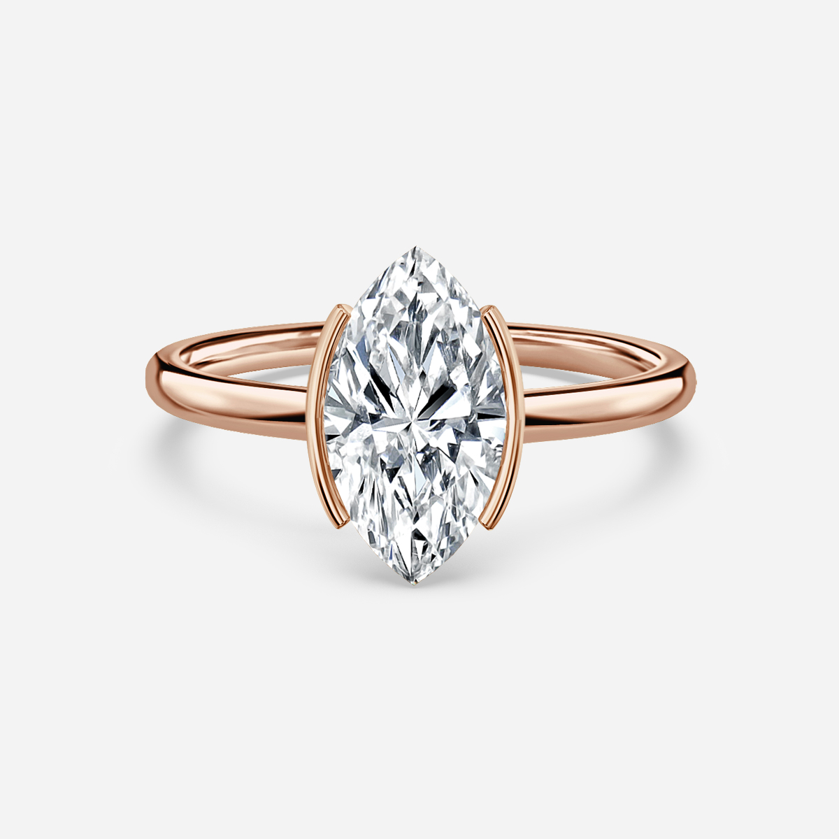 This beautiful modern rose gold engagement ring features a bezel-set center diamond with a sleek band for a contemporary look. The elevated bezel allows for maximum light play and accommodates a variety of wedding band styles to tuck underneath. Handcrafted in Hatton Gardens, London. Centre Diamond Not Included Setting only