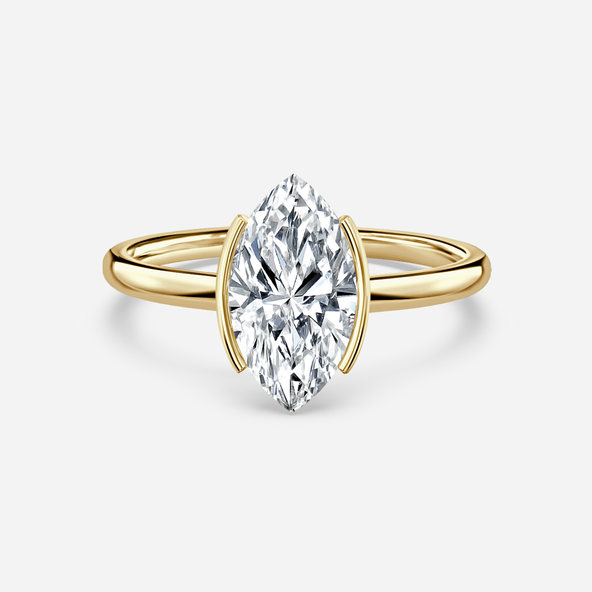 This beautiful modern yellow gold engagement ring features a bezel-set center diamond with a sleek band for a contemporary look. The elevated bezel allows for maximum light play and accommodates a variety of wedding band styles to tuck underneath. Handcrafted in Hatton Gardens, London. Centre Diamond Not Included Setting only