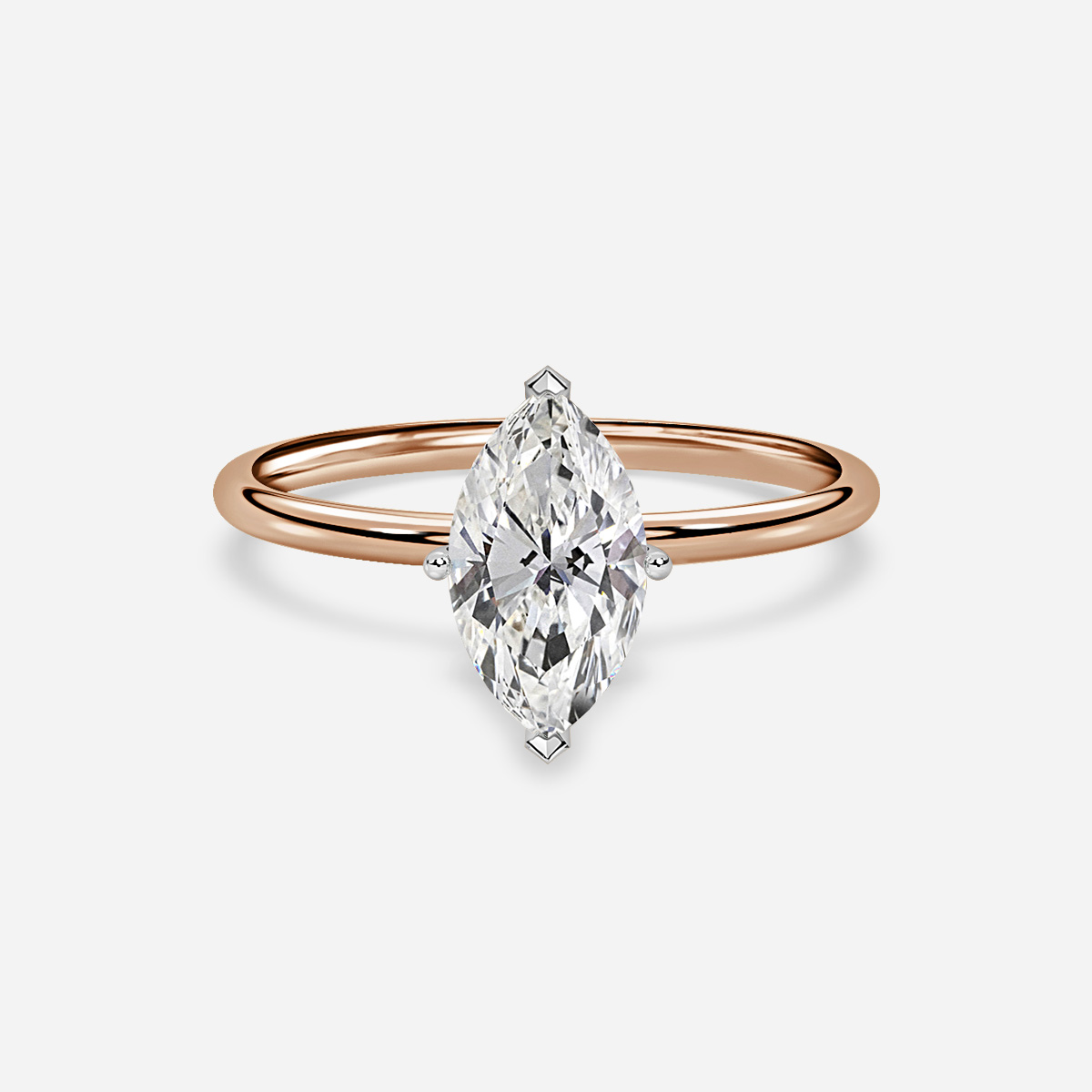 A classic rose gold two tone solitaire engagement ring supported by four prongs and delicate plain band. Handcrafted in Hatton Garden, London Centre Diamond Not Included Setting Only