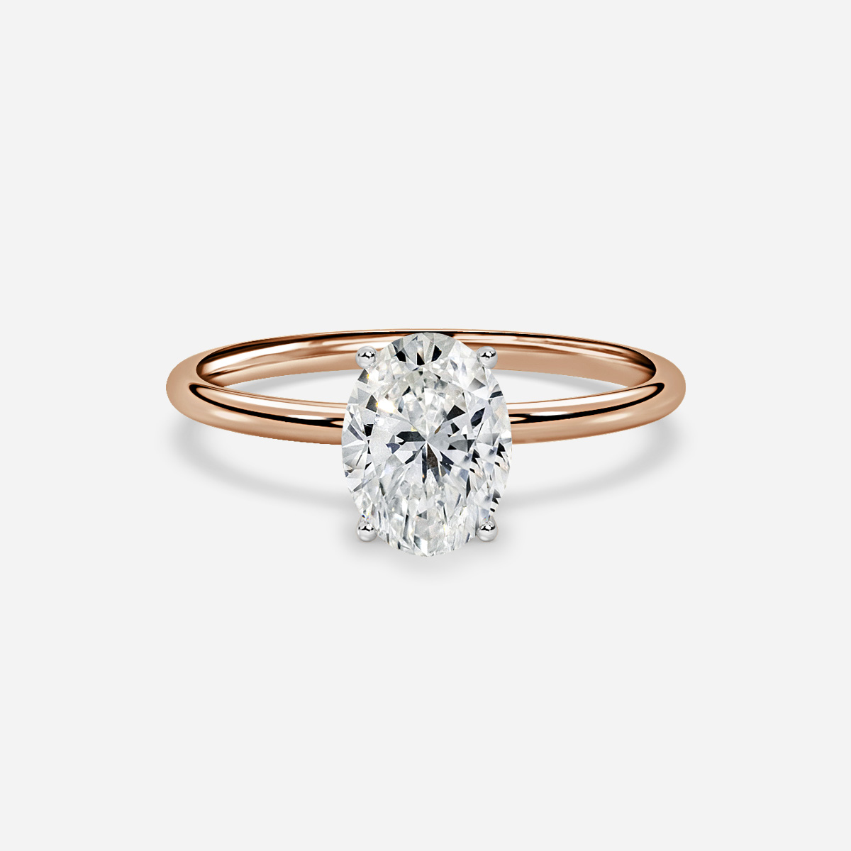 A classic rose gold two tone solitaire engagement ring supported by four prongs and delicate plain band. Handcrafted in Hatton Garden, London Centre Diamond Not Included Setting Only