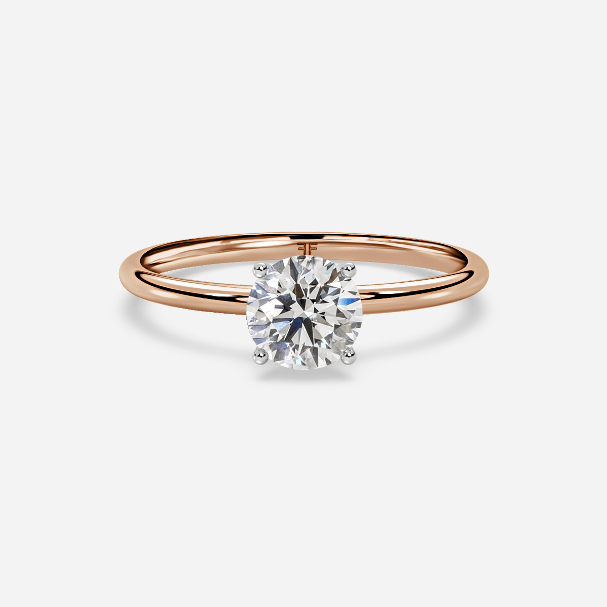 A classic rose gold two tone solitaire engagement ring supported by four prongs and delicate plain band. Handcrafted in Hatton Garden, London Centre Diamond Not Included Setting Only