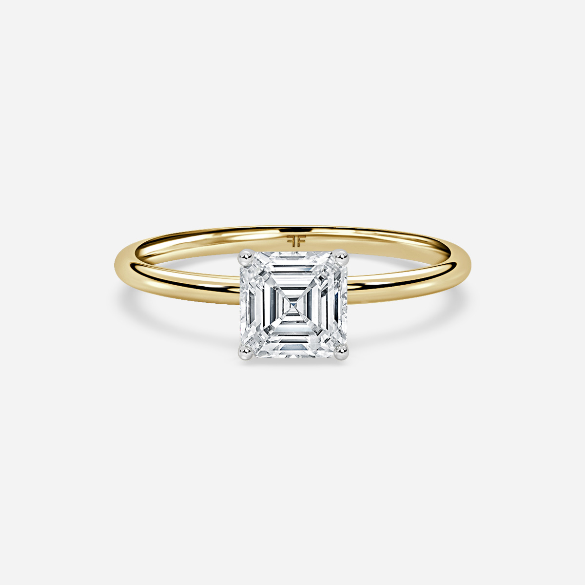 A classic yellow gold two tone solitaire engagement ring supported by four prongs and delicate plain band. Handcrafted in Hatton Garden, London Centre Diamond Not Included Setting Only