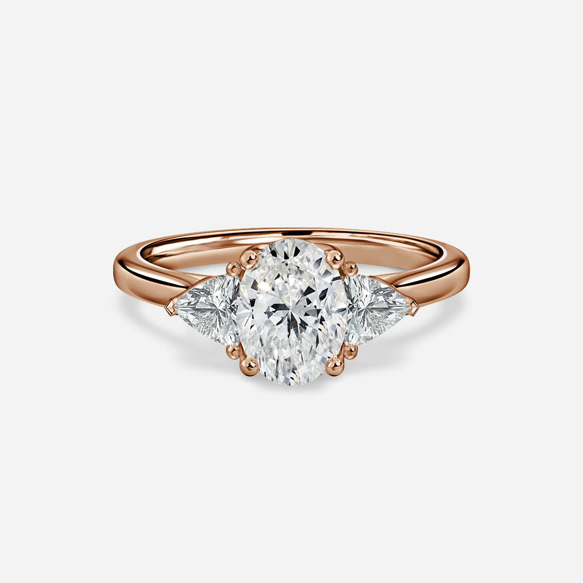 The trillion cut diamond trilogy ring is a luxurious and timeless piece of jewelry. The three diamonds in a straight row setting showcase the brilliance of the stones and the enduring elegance of rose gold. Handcrafted in Hatton Garden, London Center Diamond Not Included Setting Only