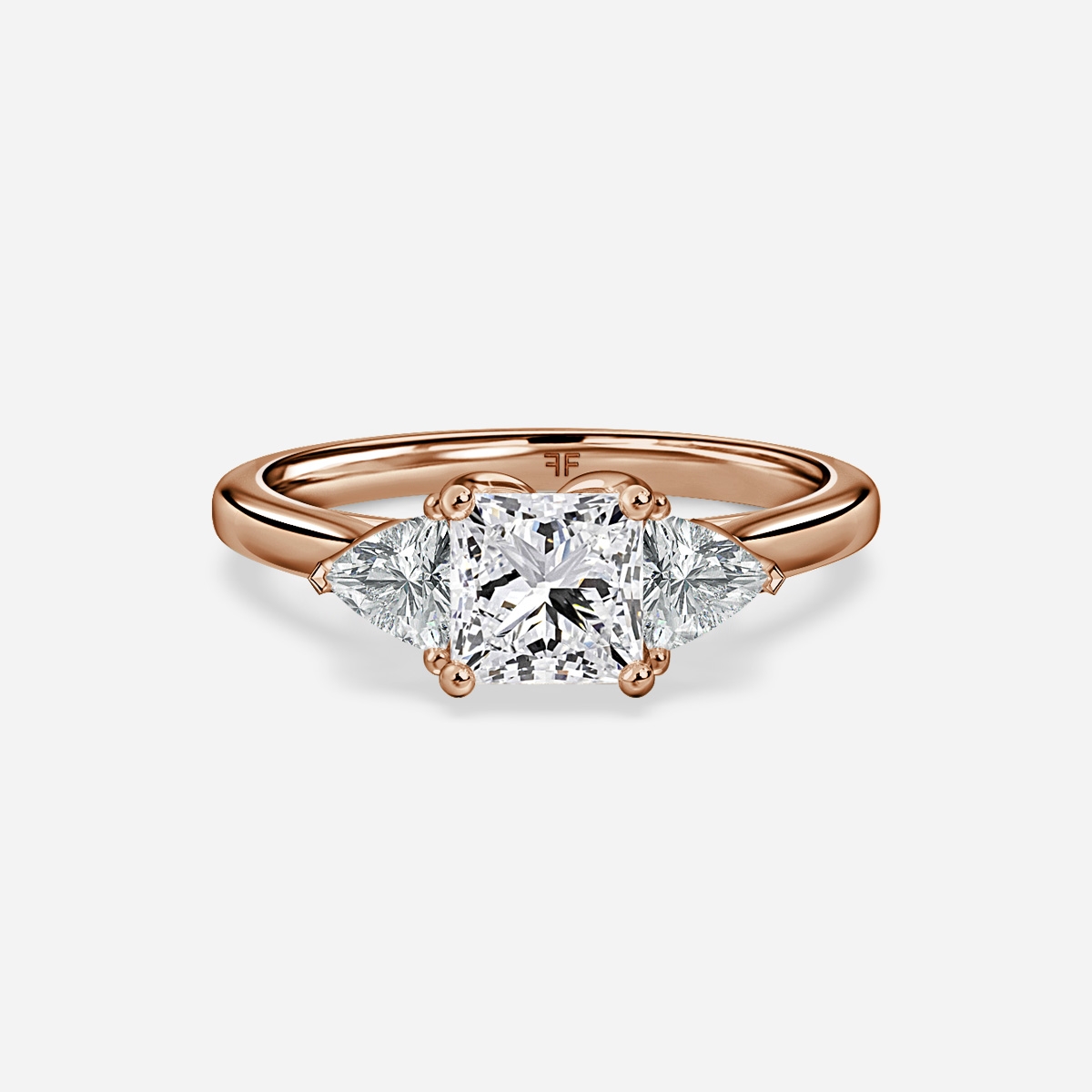 The trillion cut diamond trilogy ring is a luxurious and timeless piece of jewelry. The three diamonds in a straight row setting showcase the brilliance of the stones and the enduring elegance of rose gold. Handcrafted in Hatton Garden, London Center Diamond Not Included Setting Only