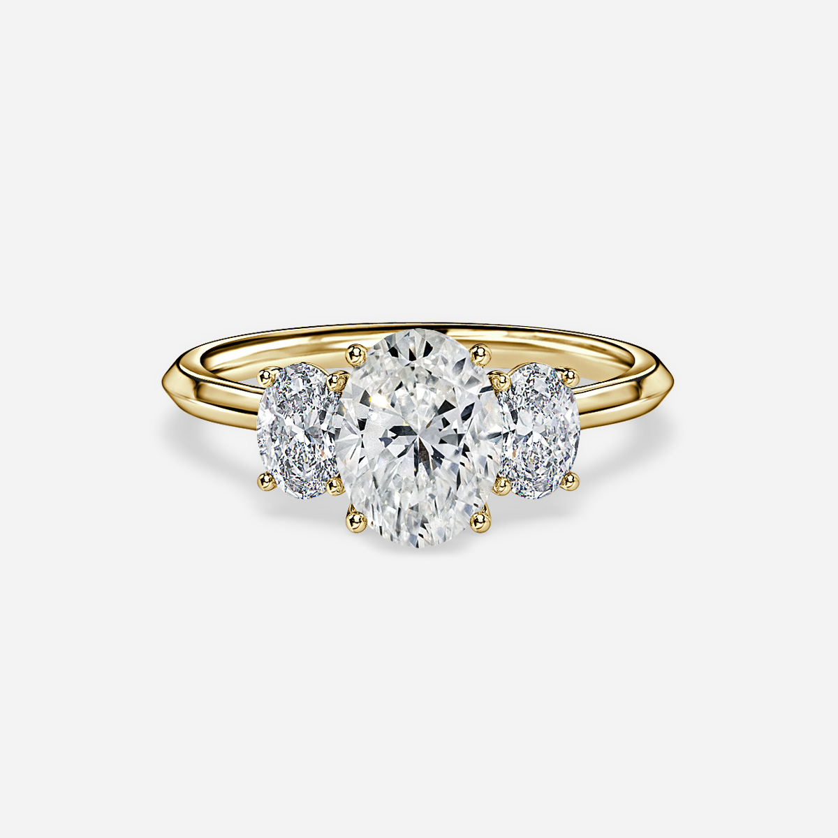 This yellow gold trilogy engagement ring features four claws to embrace two brilliant diamond side stone with that symbolize the past, present, and future tale of your relationship. Handcrafted in Hatton Garden, London Centre Diamond Not Included Setting Only