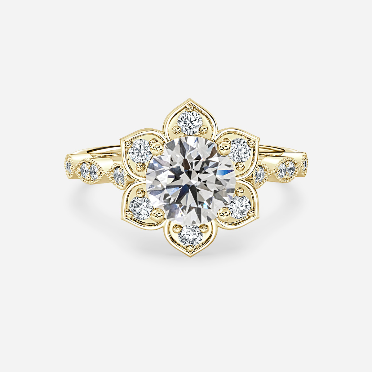 This engagement ring features a marquise-shaped band with grain set diamonds, creating a unique and intricate texture. The centerpiece is a beautiful floral design, adding a touch of elegance and romance to the ring Handcrafted in Hatton Garden, London Centre Diamond Not Included Setting Only