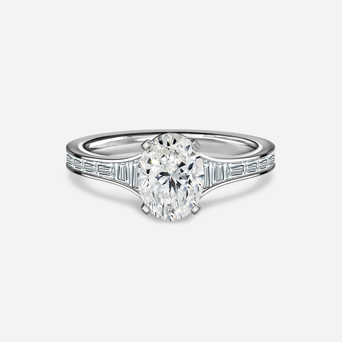 The Eloise Platinum Diamond Band Engagement Ring showcases exquisite baguette diamonds on a lustrous platinum band. This timeless design beautifully enhances the central stone, creating an elegant and refined look. Handcrafted in Hatton Gardens, London. Centre Diamond Not Included Setting Only