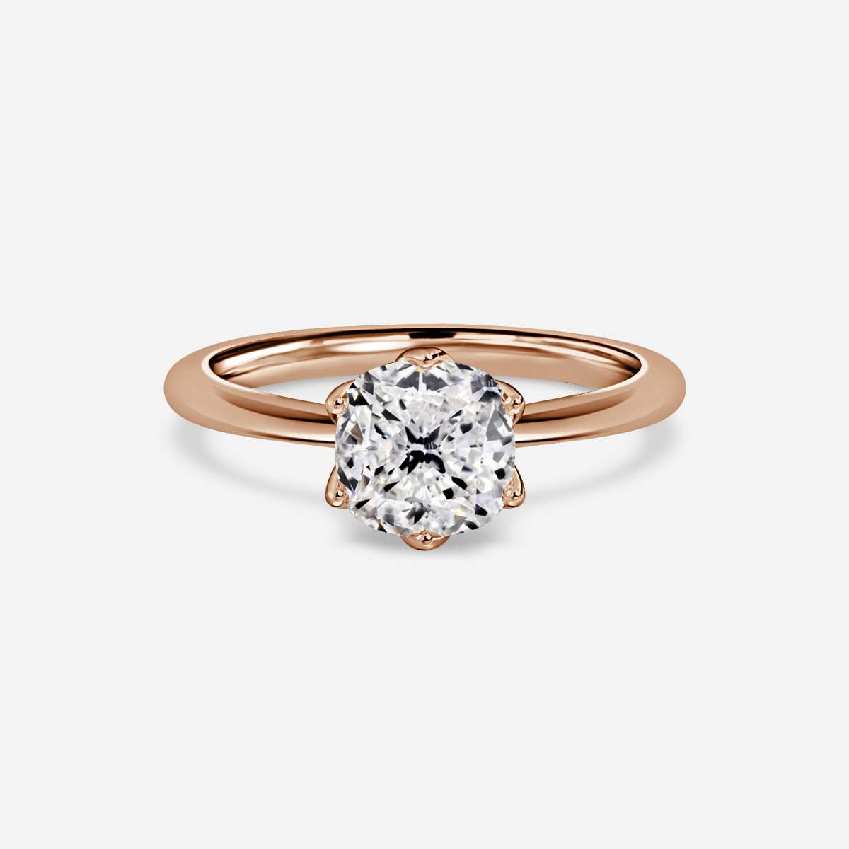 This rose gold solitaire engagement ring elevates and enhances the round brilliant cut diamond in a way in which this simple claw prong solitaire features an open basket with six elegant leaves that cradle the center diamond. Handcrafted in Hatton Gardens, London. Centre Diamond Not Included Setting Only