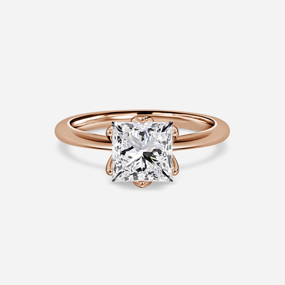This rose gold solitaire engagement ring elevates and enhances the round brilliant cut diamond in a way in which this simple claw prong solitaire features an open basket with six elegant leaves that cradle the center diamond. Handcrafted in Hatton Gardens, London. Centre Diamond Not Included Setting Only