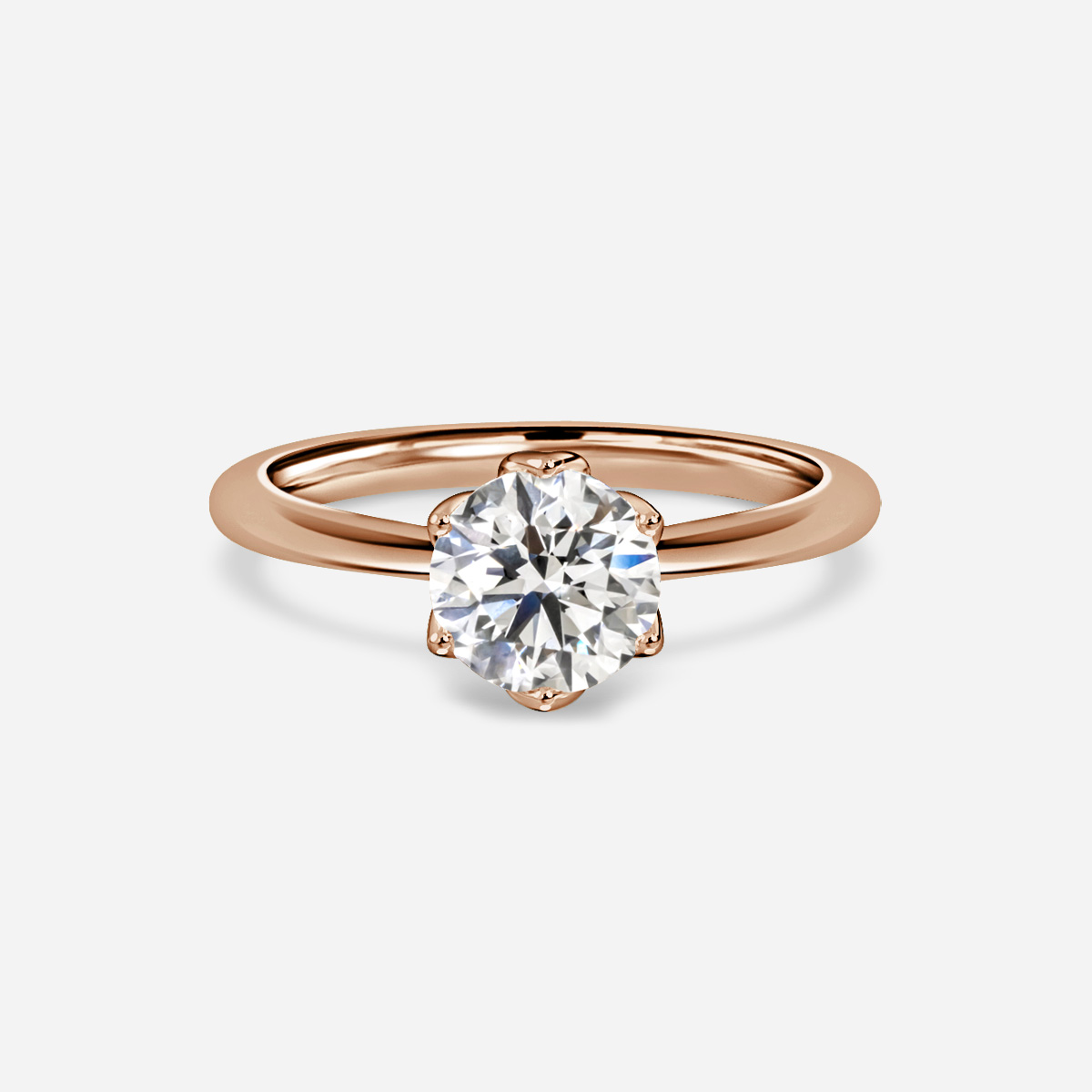 This rose gold solitaire engagement ring elevates and enhances the round brilliant cut diamond in a way in which this simple claw prong solitaire features an open basket with six elegant leaves that cradle the center diamond. Handcrafted in Hatton Gardens, London. Centre Diamond Not Included Setting Only