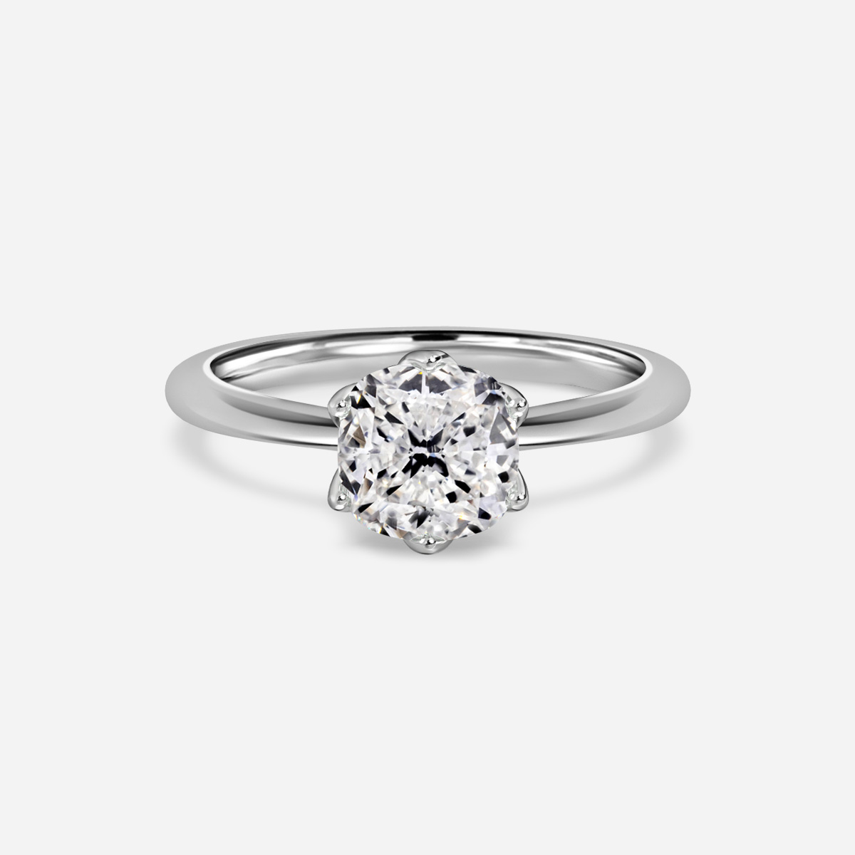 This white gold solitaire engagement ring elevates and enhances the round brilliant cut diamond in a way in which this simple claw prong solitaire features an open basket with six elegant leaves that cradle the center diamond. Handcrafted in Hatton Gardens, London. Centre Diamond Not Included Setting Only