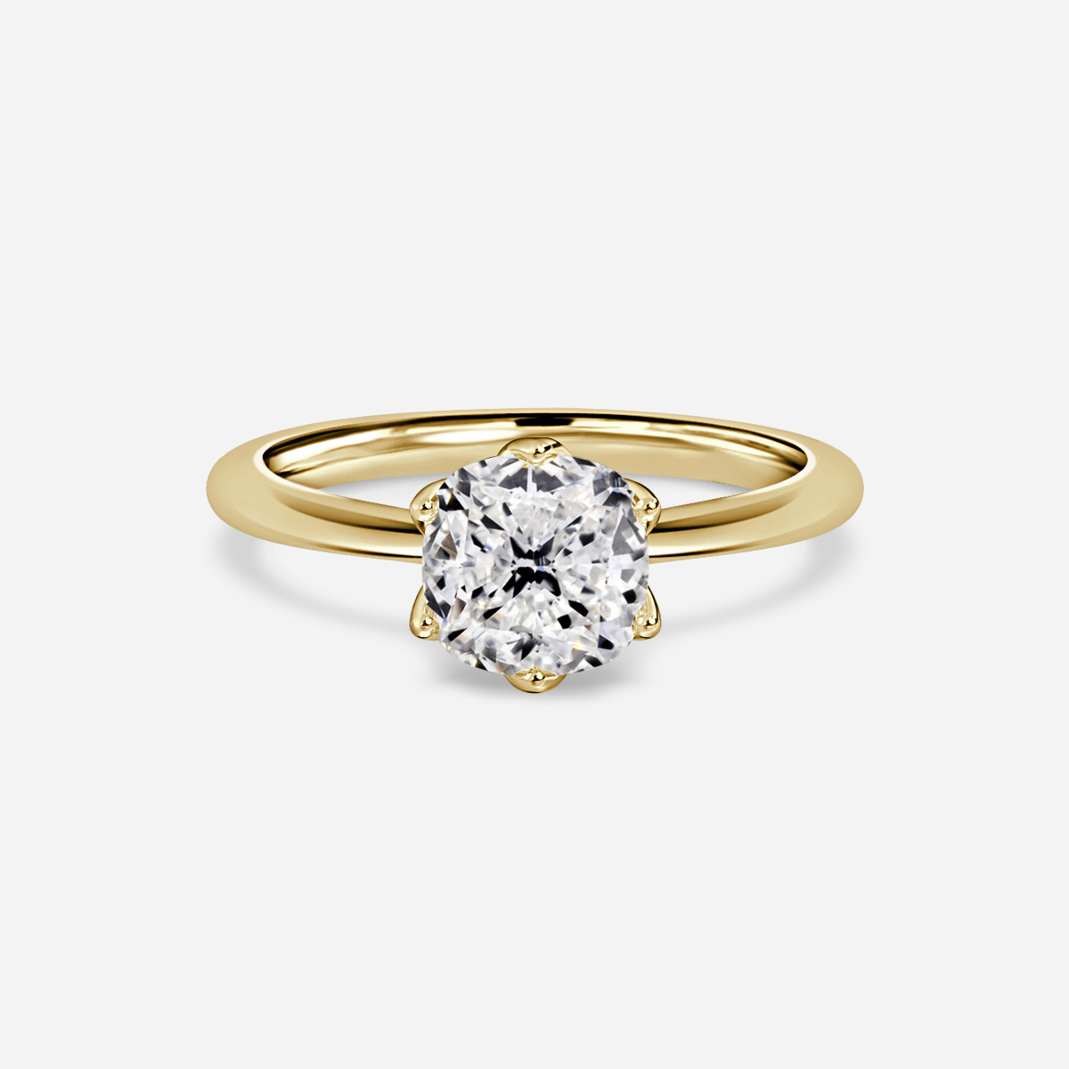 This yellow gold solitaire engagement ring elevates and enhances the round brilliant cut diamond in a way in which this simple claw prong solitaire features an open basket with six elegant leaves that cradle the center diamond. Handcrafted in Hatton Gardens, London. Centre Diamond Not Included Setting Only