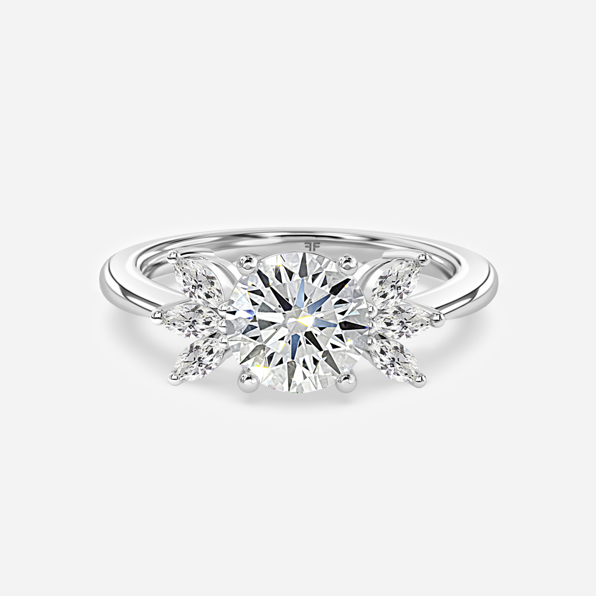 A white gold engagement ring features a radiant center stone surrounded by a dazzling array of marquise cut accent diamonds, creating a symphony of light and sparkle. Handcrafted in Hatton Garden, London Centre Diamond Not Included Setting Only