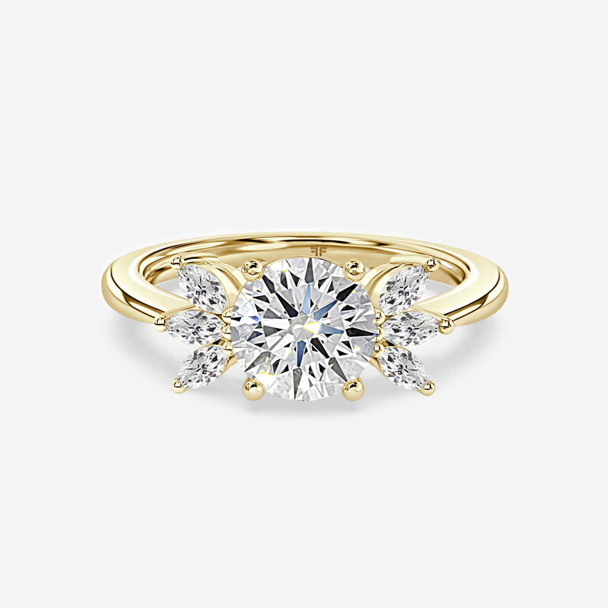 A yellow gold engagement ring features a radiant center stone surrounded by a dazzling array of marquise cut accent diamonds, creating a symphony of light and sparkle. Handcrafted in Hatton Garden, London Centre Diamond Not Included Setting Only