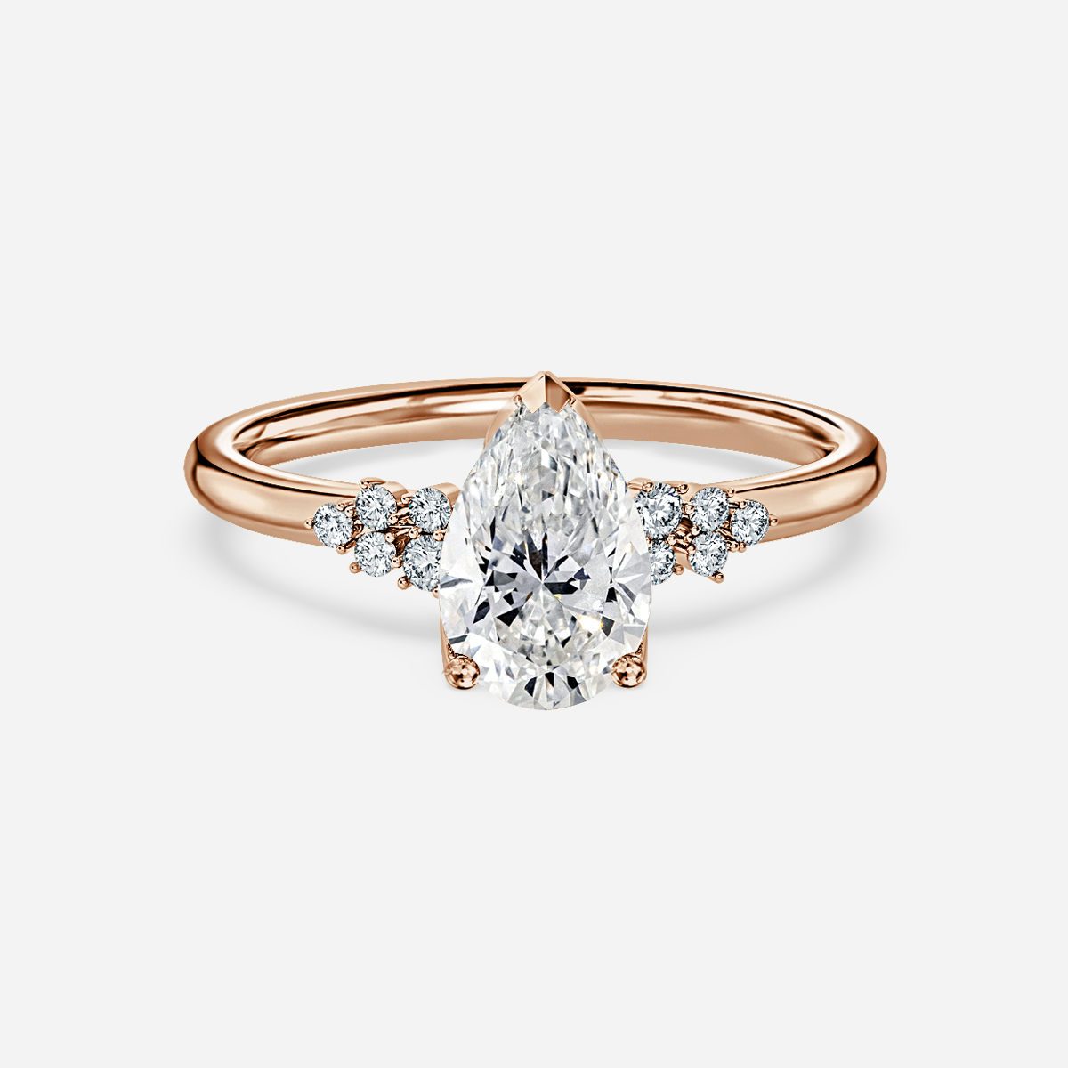 A rose gold pave engagement ring features side stones are set in a triangular shape, creating a unique and eye-catching look that wraps around the main center diamond. This creates a distinct and luxurious look that will be sure to stand out from the crowd. Handcrafted in Hatton Gardens, London. Centre Diamond Not Included Setting Only