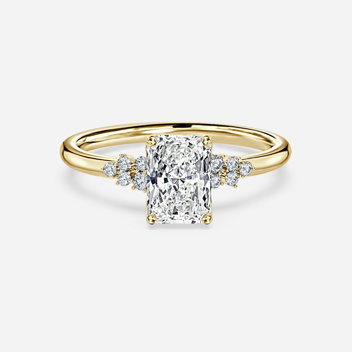 A yellow gold flower engagement ring features side stones are set in a triangular shape, creating a unique and eye-catching look that wraps around the main center diamond. This creates a distinct and luxurious look that will be sure to stand out from the crowd. Handcrafted in Hatton Gardens, London. Centre Diamond Not Included Setting Only