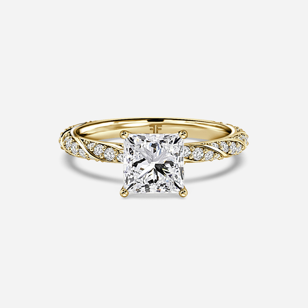 A yellow gold row of pavé diamonds twist around the band that flow up into a nature inspired petal designed collet. Handcrafted in Hatton Garden, London Centre Diamond Not Included Setting Only