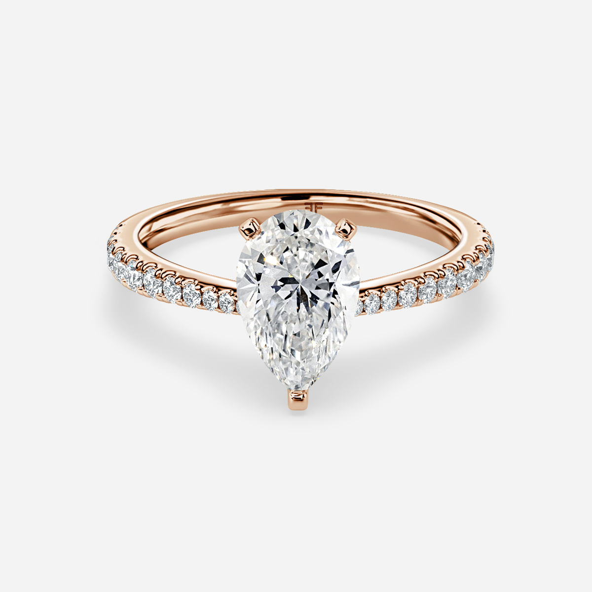 A rose gold pave taper engagement ring has a multiple small stones set into the band that gradually thin as it leads up to the center stone. Handcrafted in Hatton Garden, London Centre Diamond Not Included Setting Only