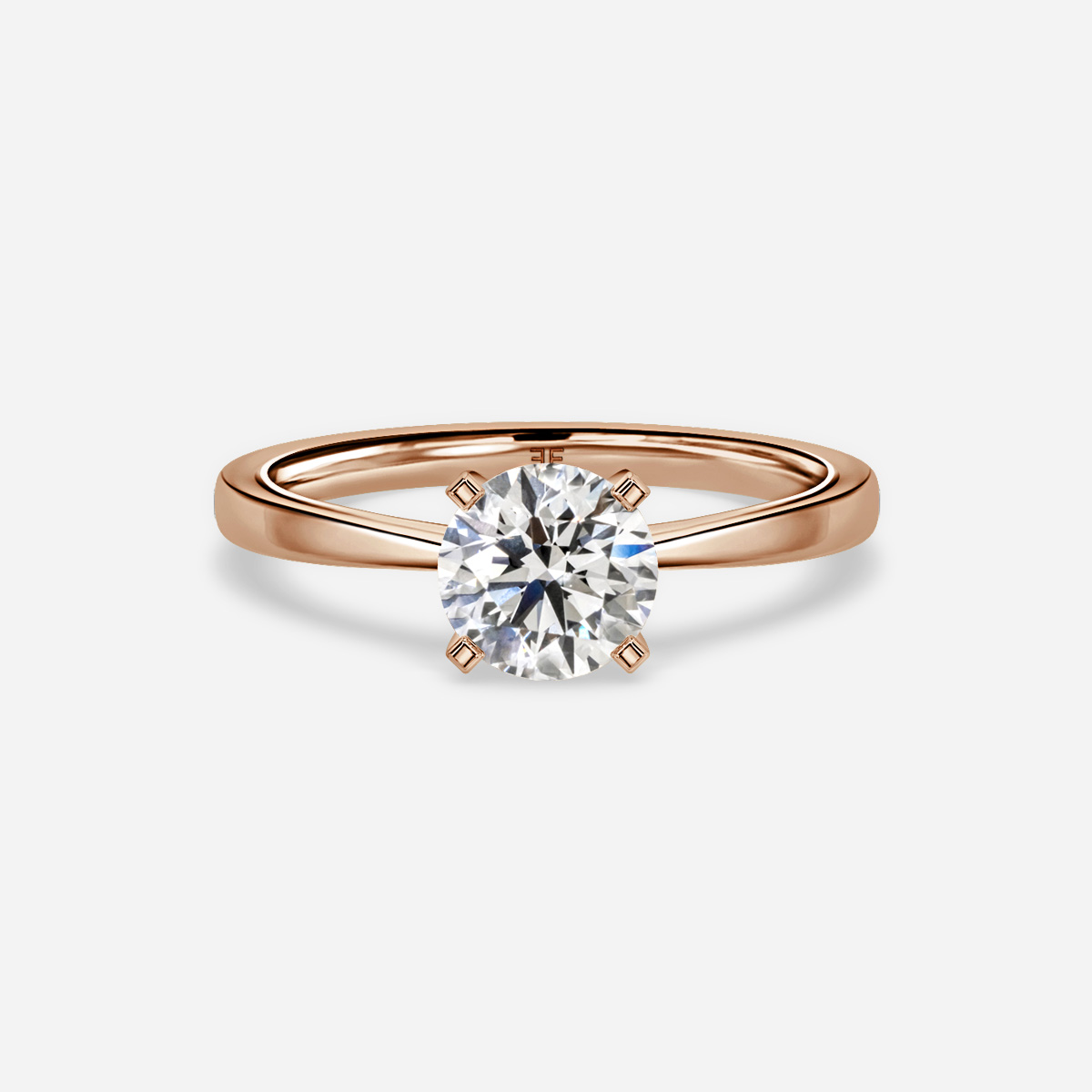 A rose gold solitaire tapered engagement ring has a band that gradually thin as it leads up to the center stone. Handcrafted in Hatton Garden, London Centre Diamond Not Included Setting Only