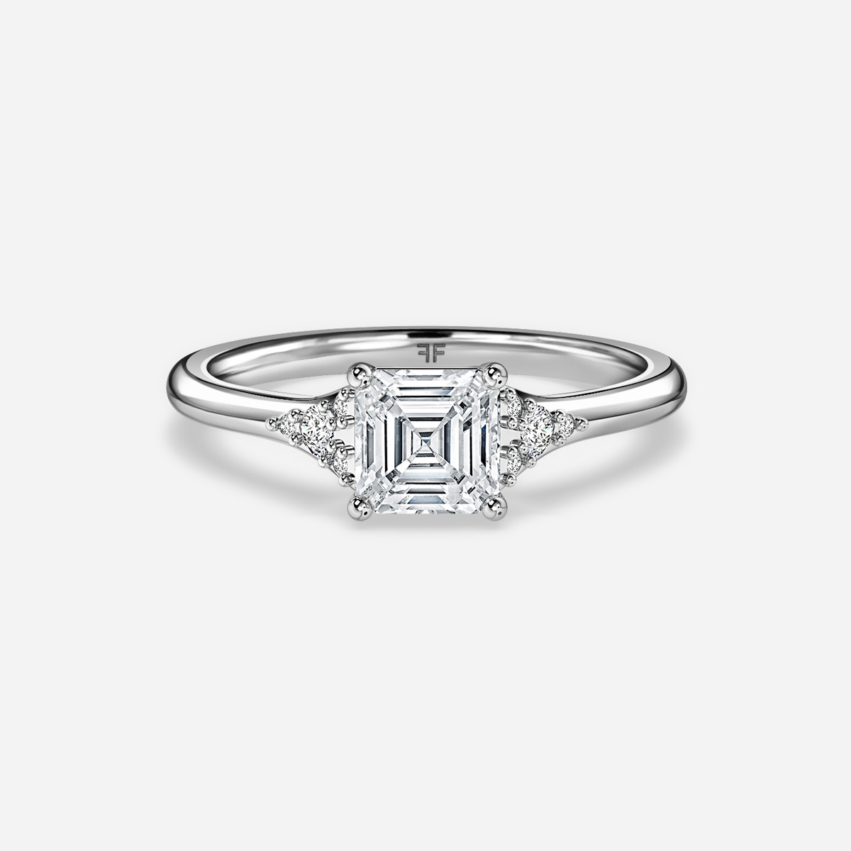 This platinum trilogy engagement ring features a dazzling cluster of four diamonds framing each side of the center gem. The gently plain band and open gallery creates a light and lustrous look. Handcrafted in Hatton Gardens, London. Centre Diamond Not Included Setting only