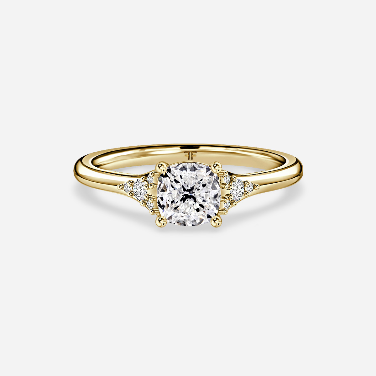 This yellow gold trilogy engagement ring features a dazzling cluster of four diamonds framing each side of the center gem. The gently plain band and open gallery creates a light and lustrous look. Handcrafted in Hatton Gardens, London. Centre Diamond Not Included Setting only