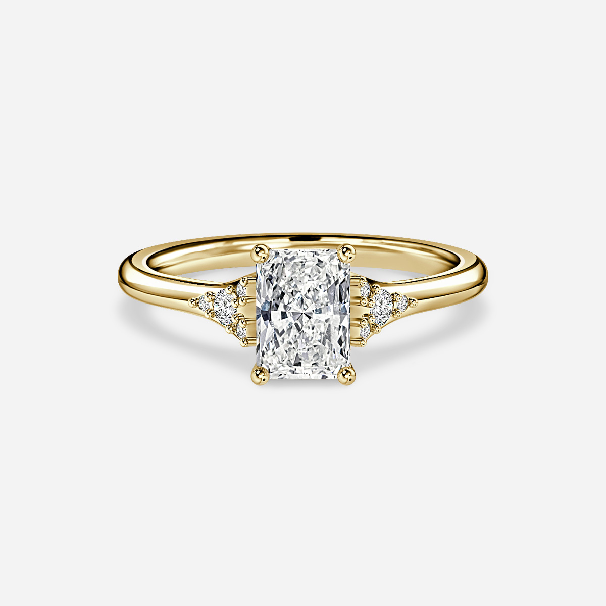 This yellow gold trilogy engagement ring features a dazzling cluster of four diamonds framing each side of the center gem. The gently plain band and open gallery creates a light and lustrous look. Handcrafted in Hatton Gardens, London. Centre Diamond Not Included Setting only