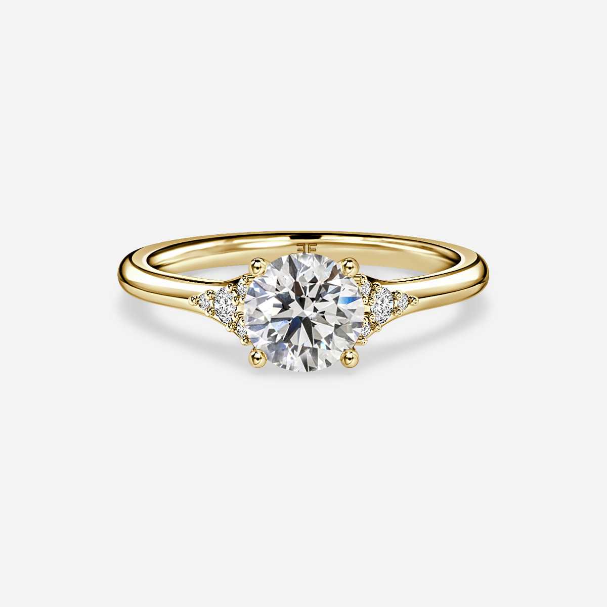 This yellow gold trilogy engagement ring features a dazzling cluster of four diamonds framing each side of the center gem. The gently plain band and open gallery creates a light and lustrous look. Handcrafted in Hatton Gardens, London. Centre Diamond Not Included Setting only