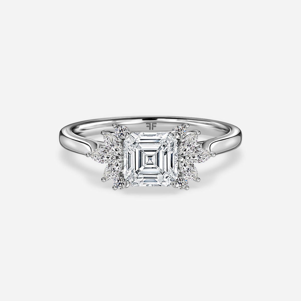 Exuding timeless elegance, the Holly Platinum Cluster Engagement Ring showcases a captivating design. Three sets of marquise diamonds gracefully cradle a central stone, while two round diamonds on either side enhance its brilliance and allure. Crafted with meticulous attention to detail, this ring epitomizes sophistication and romance, making it a cherished symbol of love and commitment. Handcrafted in Hatton Gardens, London. Centre Diamond Not Included Setting only