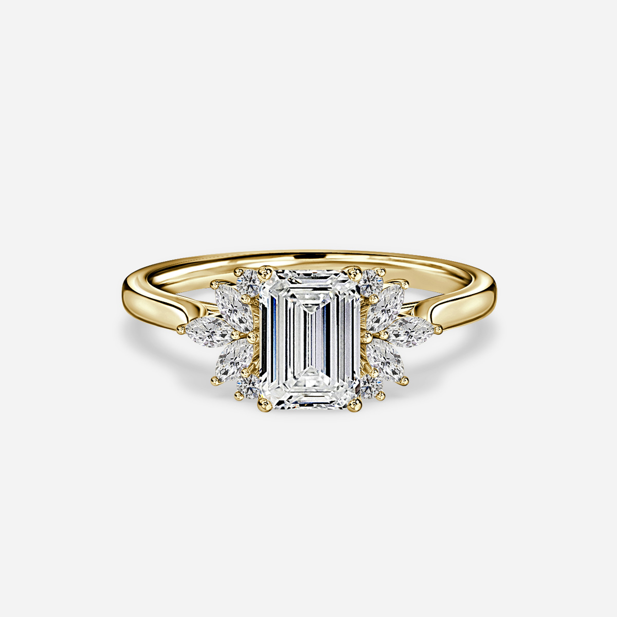 Exuding timeless elegance, the Holly Yellow Gold Flower Engagement Ring showcases a captivating design. Three sets of marquise diamonds gracefully cradle a central stone, while two round diamonds on either side enhance its brilliance and allure. Crafted with meticulous attention to detail, this ring epitomizes sophistication and romance, making it a cherished symbol of love and commitment. Handcrafted in Hatton Gardens, London. Centre Diamond Not Included Setting only