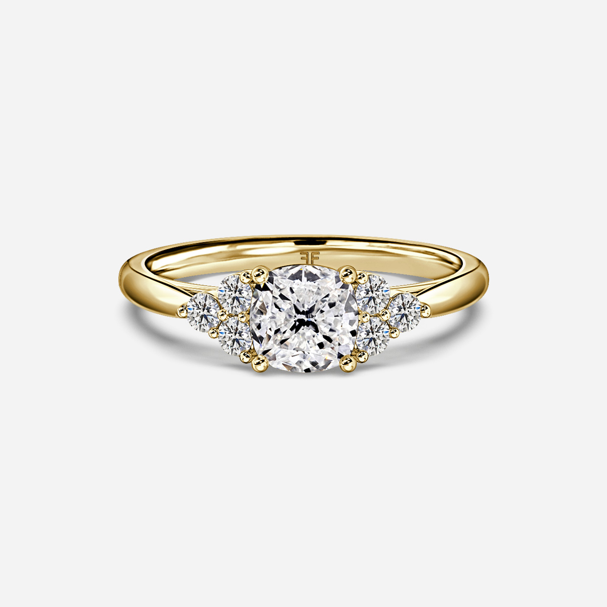 Brilliant and Elegant this yellow gold trilogy engagement ring featuring three sparkling diamonds set around a center stone, creating a stunning ring with a unique and luxurious look. Handcrafted in Hatton Gardens, London. Centre Diamond Not Included Setting Only