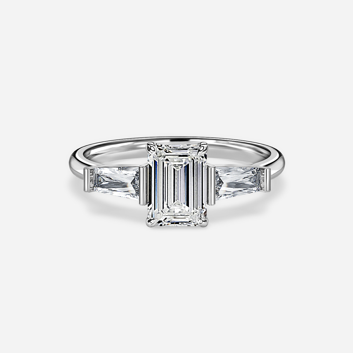 BROWSE READY TO SHIP RINGSA platinum three stone engagement ring is held in a classic four-prong setting and accented by 0.30ct two tapered baguette diamonds. Handcrafted in Hatton Gardens, London. Centre Diamond Not Included Setting Only