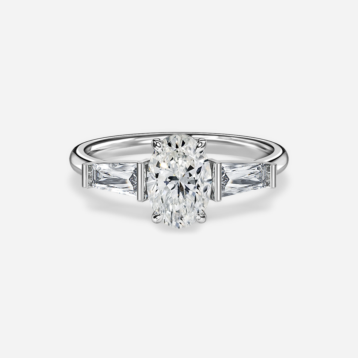 A platinum three stone engagement ring is held in a classic four-prong setting and accented by 0.30ct two tapered baguette diamonds. Handcrafted in Hatton Gardens, London. Centre Diamond Not Included Setting Only