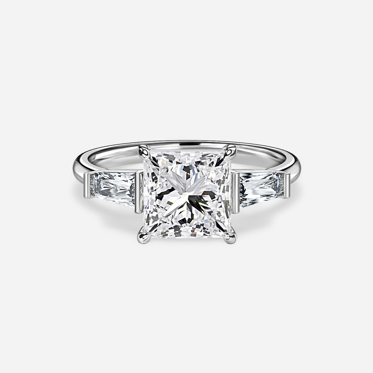 BROWSE READY TO SHIP RINGSA platinum three stone engagement ring is held in a classic four-prong setting and accented by 0.30ct two tapered baguette diamonds. Handcrafted in Hatton Gardens, London. Centre Diamond Not Included Setting Only