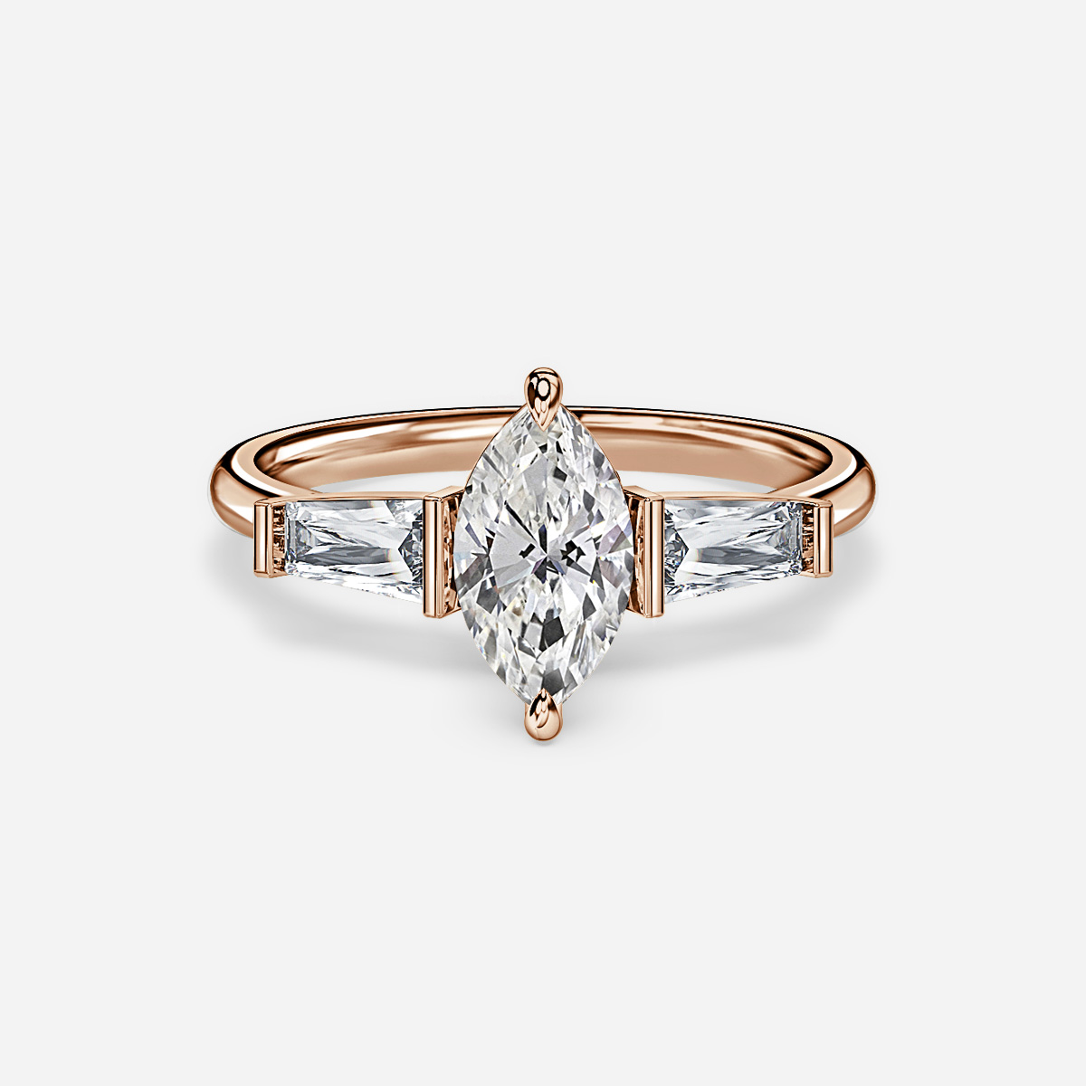 BROWSE READY TO SHIP RINGSA rose gold three stone engagement ring is held in a classic four-prong setting and accented by 0.30ct two tapered baguette diamonds. Handcrafted in Hatton Gardens, London. Centre Diamond Not Included Setting Only
