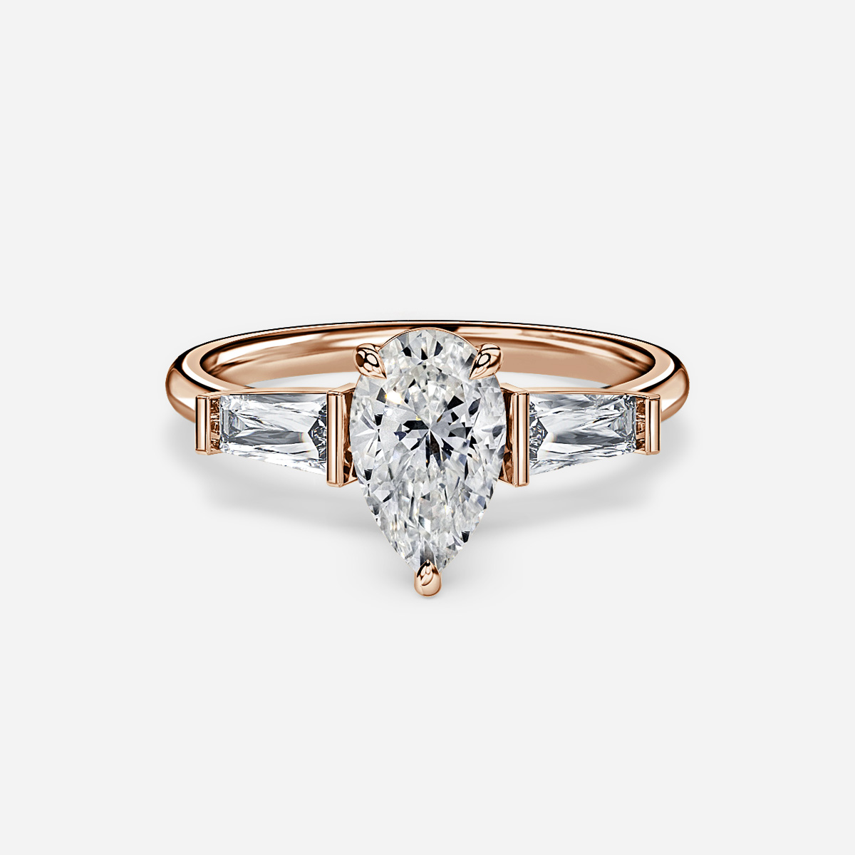 A rose gold three stone engagement ring is held in a classic four-prong setting and accented by 0.30ct two tapered baguette diamonds. Handcrafted in Hatton Gardens, London. Centre Diamond Not Included Setting Only